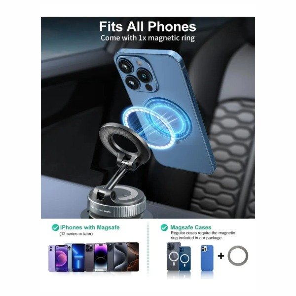 • Compatible con todos los smartphones. En celulares Android y Iphones sin Magsafe se pega el aro metálico incluido. En Iphones 12 en adelante, no es necesario.