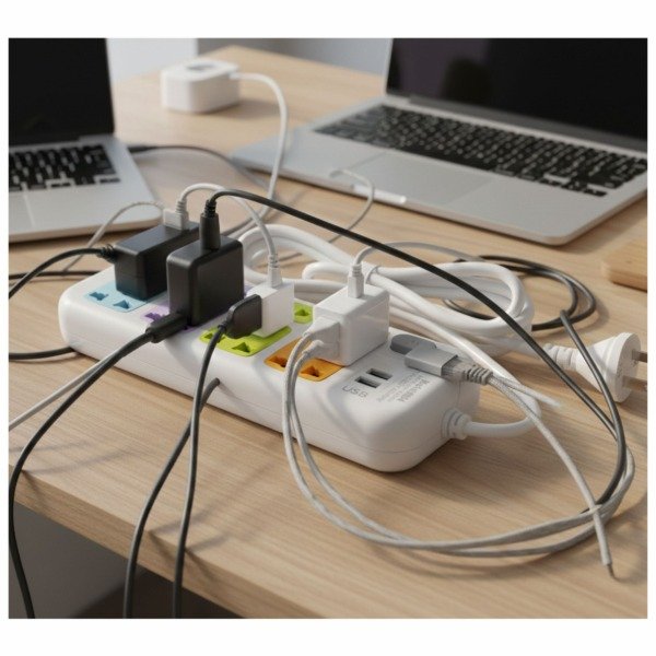 - Oficinas y escritorios con múltiples dispositivos (monitores, PC, impresoras, lámparas).